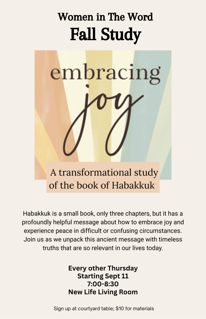 We’ll be studying the book of Habakkuk — only three chapters long, but with a powerful and deeply relevant message. The book records a conversation between God and the prophet Habakkuk, who wrestled with questions about God’s justice and what seemed like His silence in response to prayer. Since doubts, anxieties, and discouragement are things we all struggle with at times, taking the opportunity to explore this dialogue and the timeless truths it reveals offers us both encouragement and hope. In fact, the lessons in Habakkuk can teach us to embrace joy! (That’s the title of our study book.)